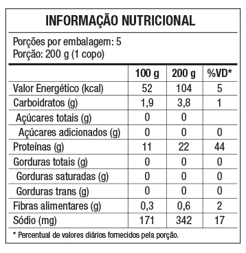Bebida rica em proteína com 20g por porção de 200g. É uma excelente fonte natural de proteína com baixo teor de carboidratos, sem gordura, sem adição de açúcar ou sódio.
